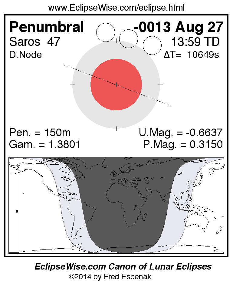 Penumbral Lunar Eclipse of -0013 Aug 27 (0014 Aug 27 BCE)