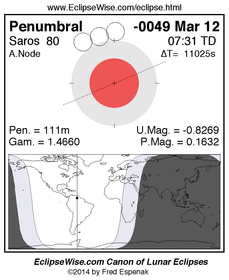 Another lunar eclipse occurs one synodic month before the -0049 Mar 12 eclipse. It is the penumbral lunar eclipse of -0049 Feb 10.