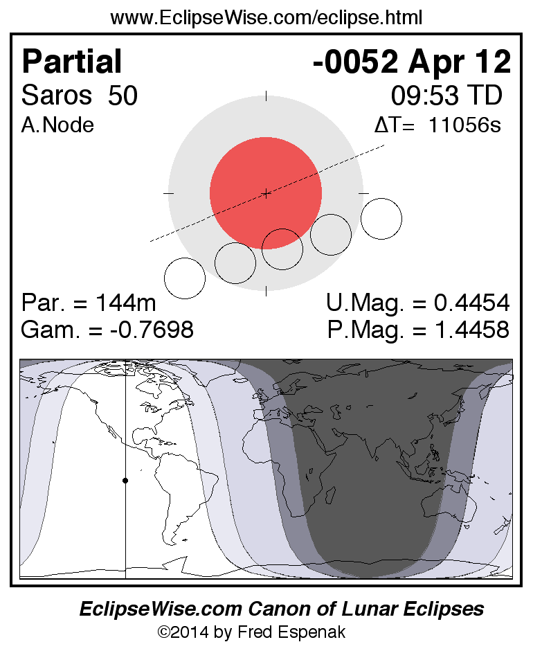 The partial lunar eclipse of -0052 Apr 12 is followed two weeks later by a total solar eclipse on -0052 Apr 27.