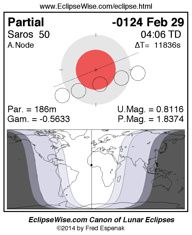 The instant of greatest eclipse takes place on -0124 Feb 29 at 04:06:21 TD (00:49:07 UT1).