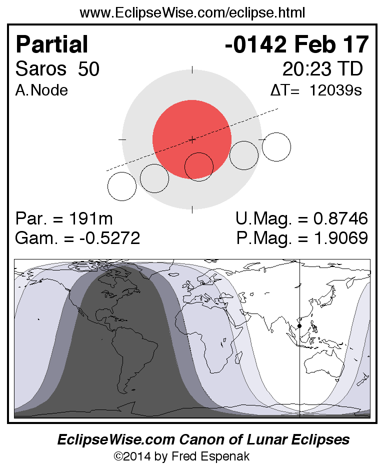 The instant of greatest eclipse takes place on -0142 Feb 17 at 20:23:05 TD (17:02:28 UT1).