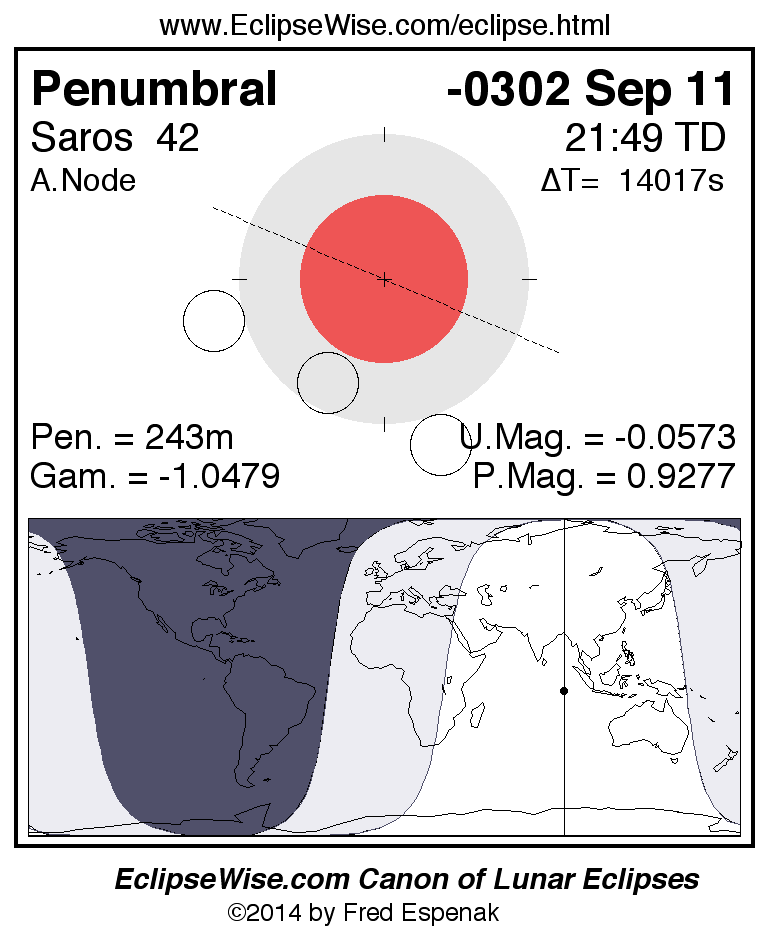 The instant of greatest eclipse takes place on -0302 Sep 11 at 21:48:39 TD (17:55:04 UT1).