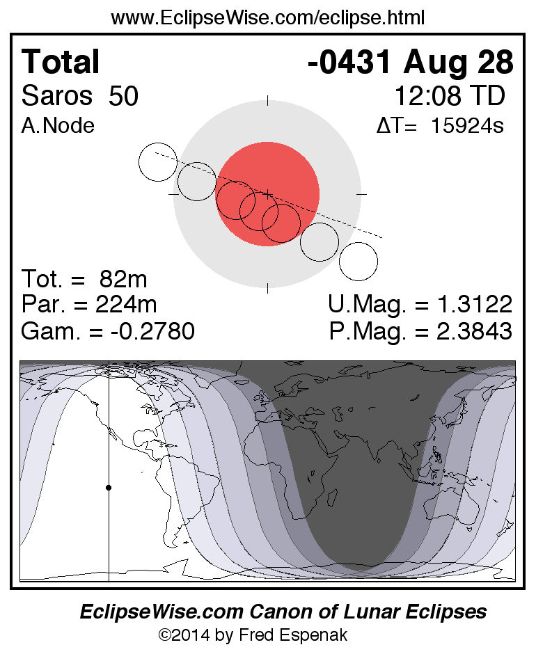 The instant of greatest eclipse takes place on -0431 Aug 28 at 12:08:12 TD (07:42:51 UT1).