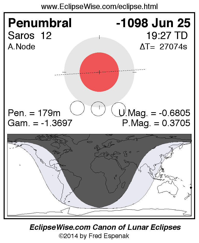 Another lunar eclipse occurs one synodic month after the -1098 Jun 25 eclipse. It is the penumbral lunar eclipse of -1098 Jul 25.