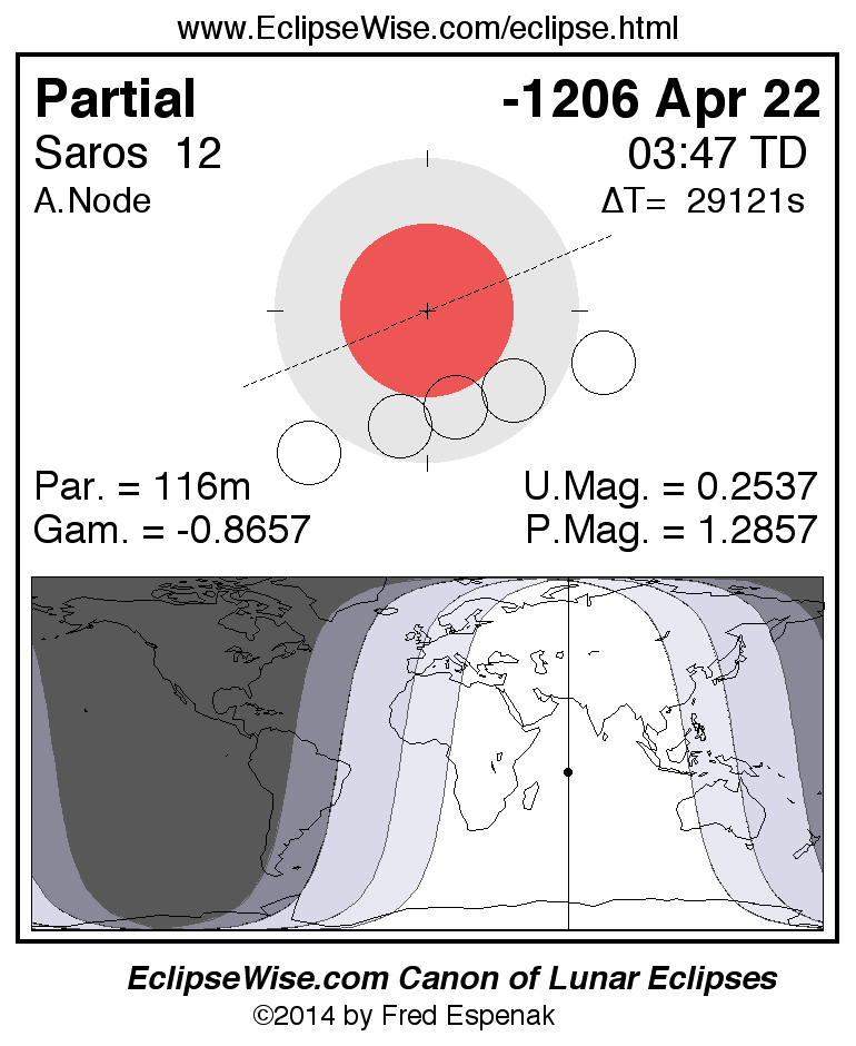 The instant of greatest eclipse takes place on -1206 Apr 22 at 03:46:45 TD (19:41:28 UT1).