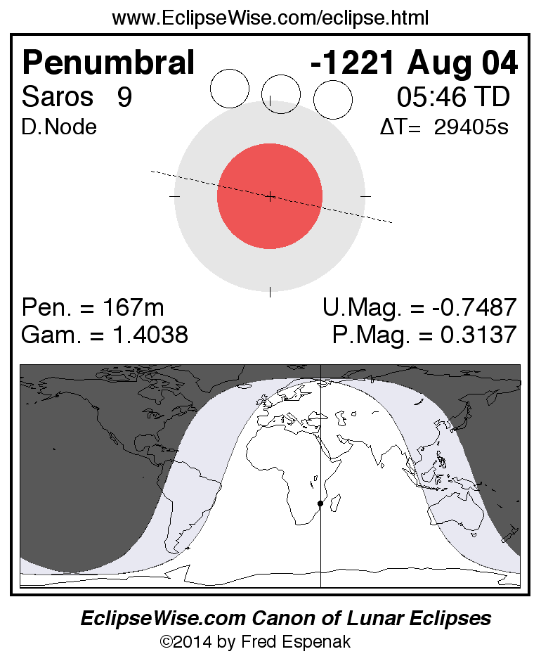 Penumbral Lunar Eclipse of -1221 Aug 04 (1222 Aug 04 BCE)