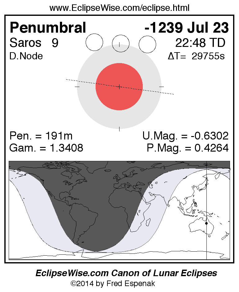 Another lunar eclipse occurs one synodic month after the -1239 Jul 23 eclipse. It is the penumbral lunar eclipse of -1239 Aug 22.