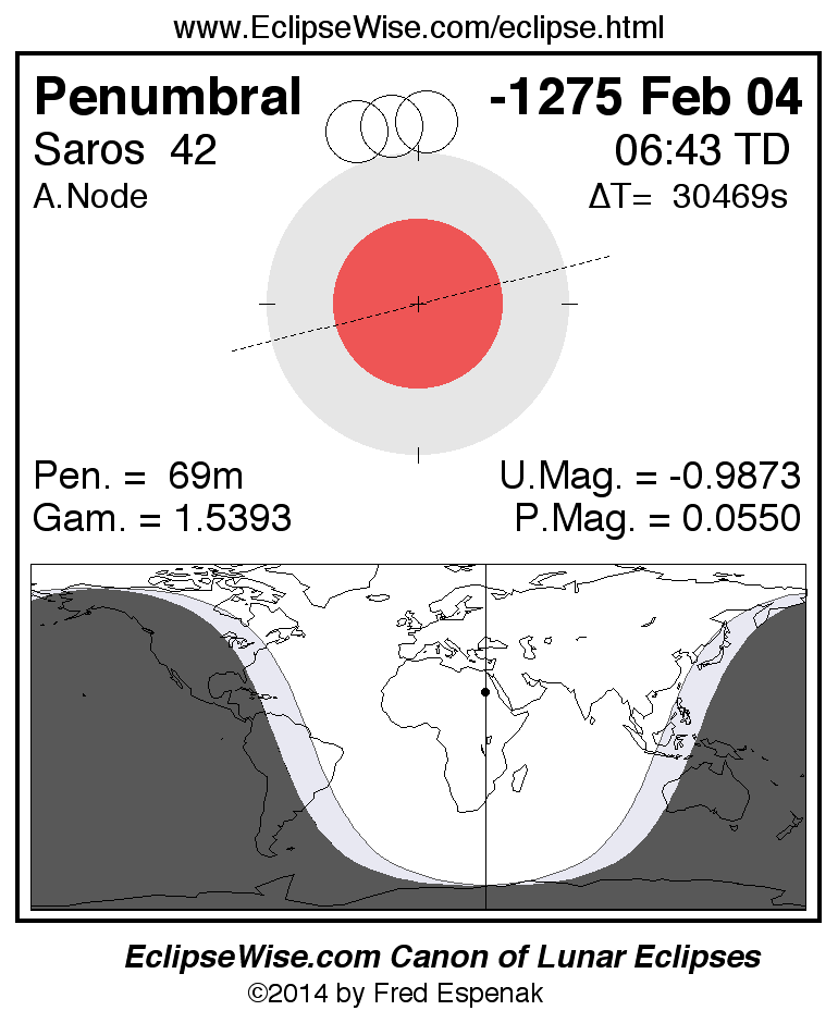 Another lunar eclipse occurs one synodic month before the -1275 Feb 04 eclipse. It is the penumbral lunar eclipse of -1275 Jan 05.