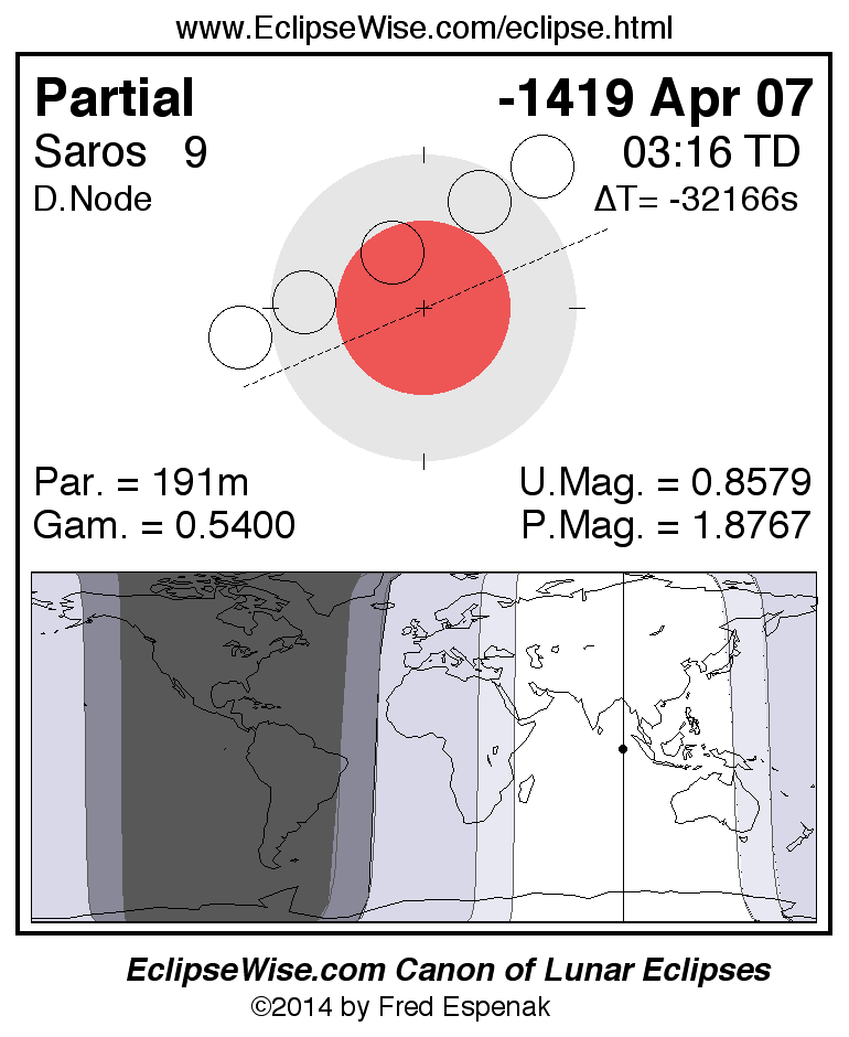 The instant of greatest eclipse takes place on -1419 Apr 07 at 03:16:08 TD (18:00:02 UT1).