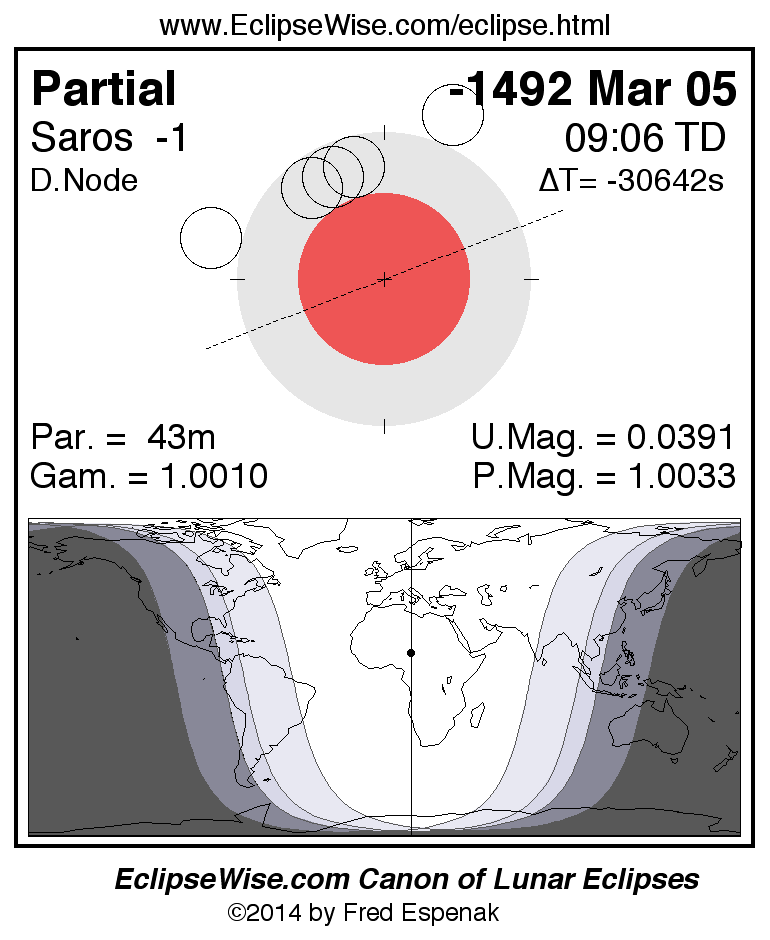 Another lunar eclipse occurs one synodic month after the -1492 Mar 05 eclipse. It is the penumbral lunar eclipse of -1492 Apr 03.