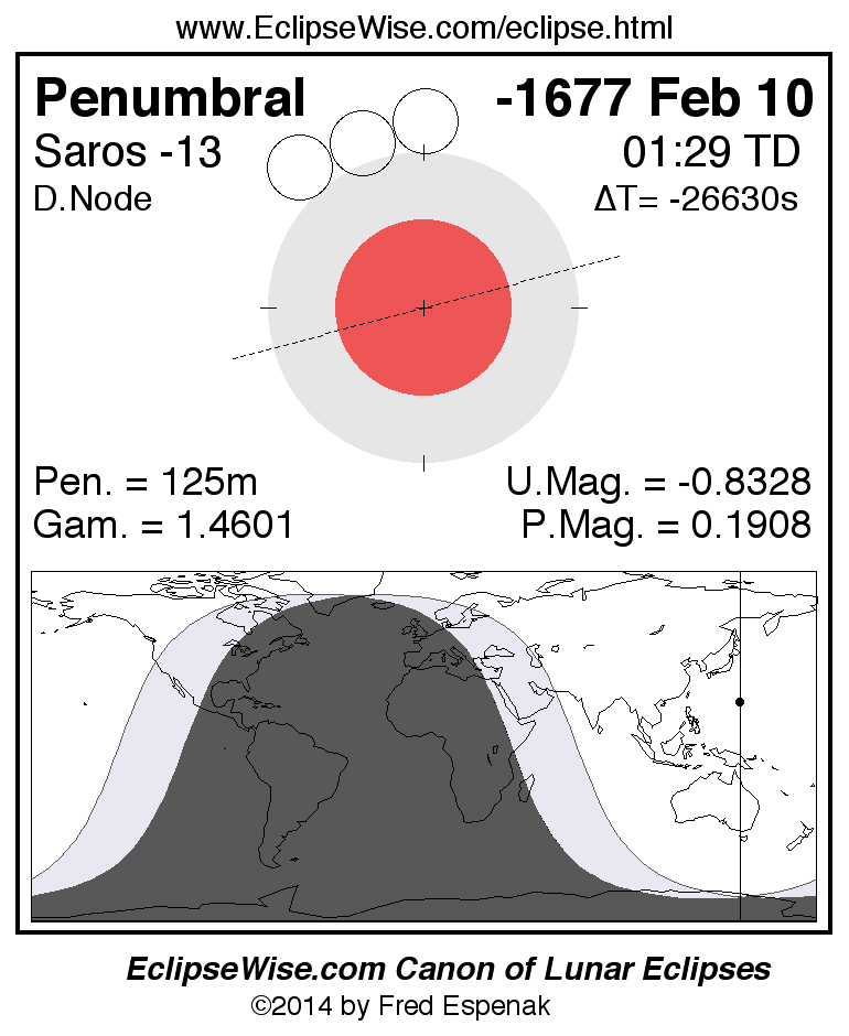 The instant of greatest eclipse takes place on -1677 Feb 10 at 01:29:26 TD (14:41:05 UT1).