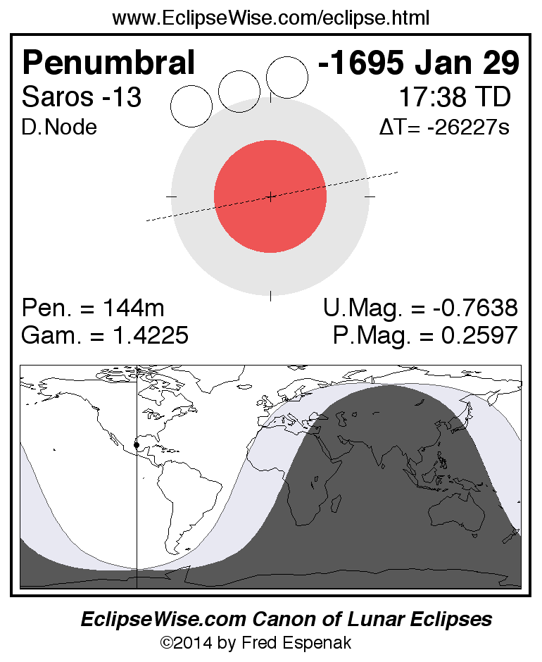 Another lunar eclipse occurs one synodic month after the -1695 Jan 29 eclipse. It is the penumbral lunar eclipse of -1695 Feb 28.