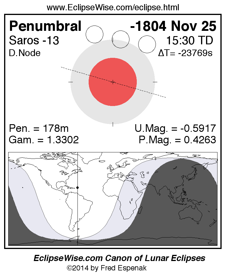 Another lunar eclipse occurs one synodic month after the -1804 Nov 25 eclipse. It is the penumbral lunar eclipse of -1804 Dec 25.