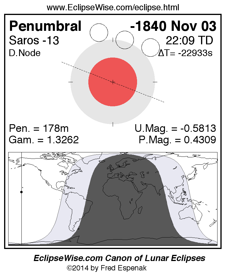 Another lunar eclipse occurs one synodic month after the -1840 Nov 03 eclipse. It is the penumbral lunar eclipse of -1840 Dec 03.
