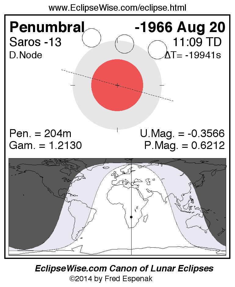 Another lunar eclipse occurs one synodic month after the -1966 Aug 20 eclipse. It is the penumbral lunar eclipse of -1966 Sep 18.