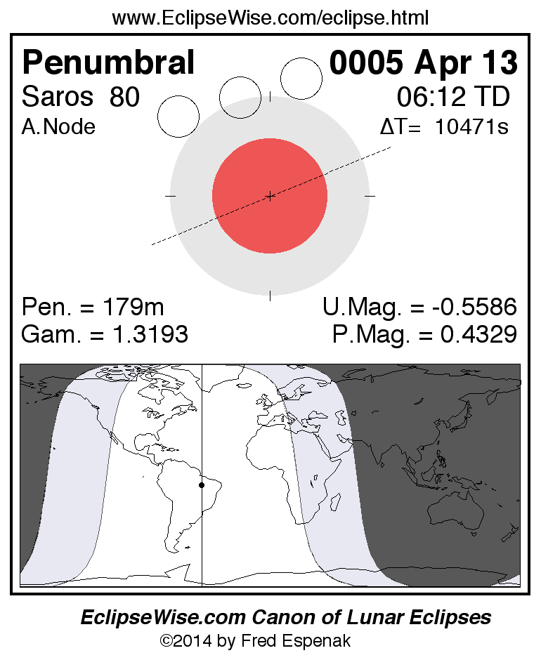 Another lunar eclipse occurs one synodic month before the 0005 Apr 13 eclipse. It is the penumbral lunar eclipse of 0005 Mar 14.
