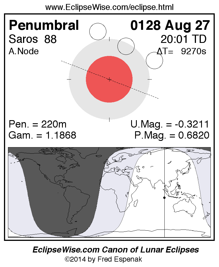Another lunar eclipse occurs one synodic month before the 0128 Aug 27 eclipse. It is the penumbral lunar eclipse of 0128 Jul 29.