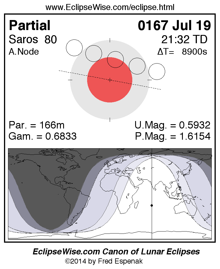 The instant of greatest eclipse takes place on 0167 Jul 19 at 21:32:15 TD (19:03:55 UT1).
