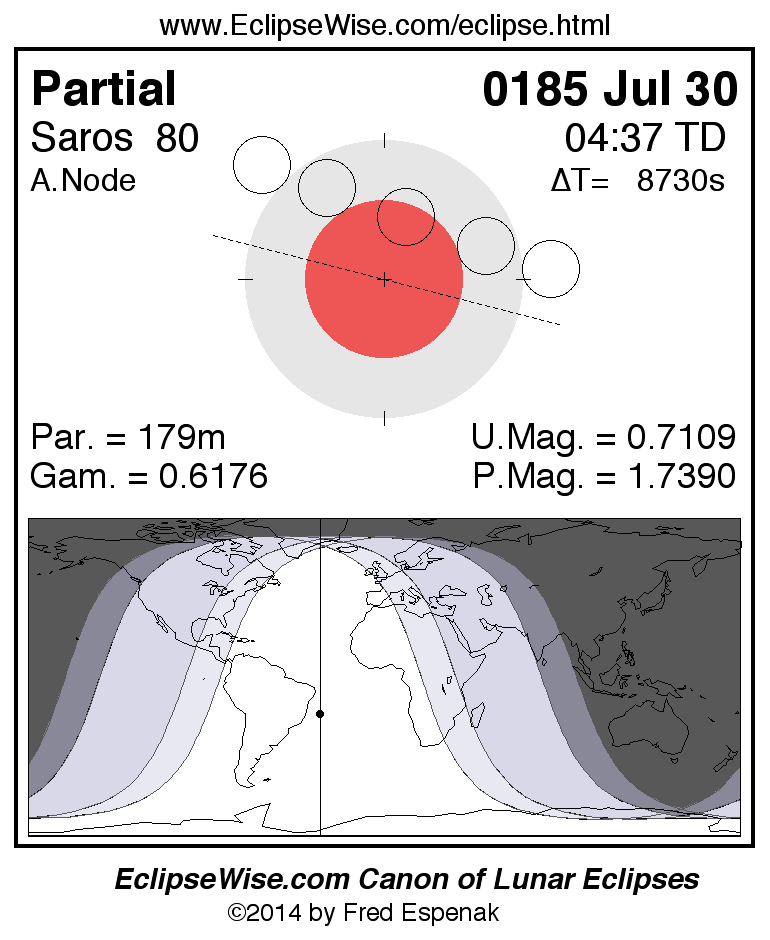 The instant of greatest eclipse takes place on 0185 Jul 30 at 04:36:44 TD (02:11:15 UT1).