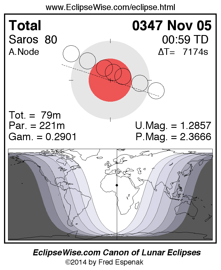 The total lunar eclipse of 0347 Nov 05 is preceded two weeks earlier by a partial solar eclipse on 0347 Oct 20.