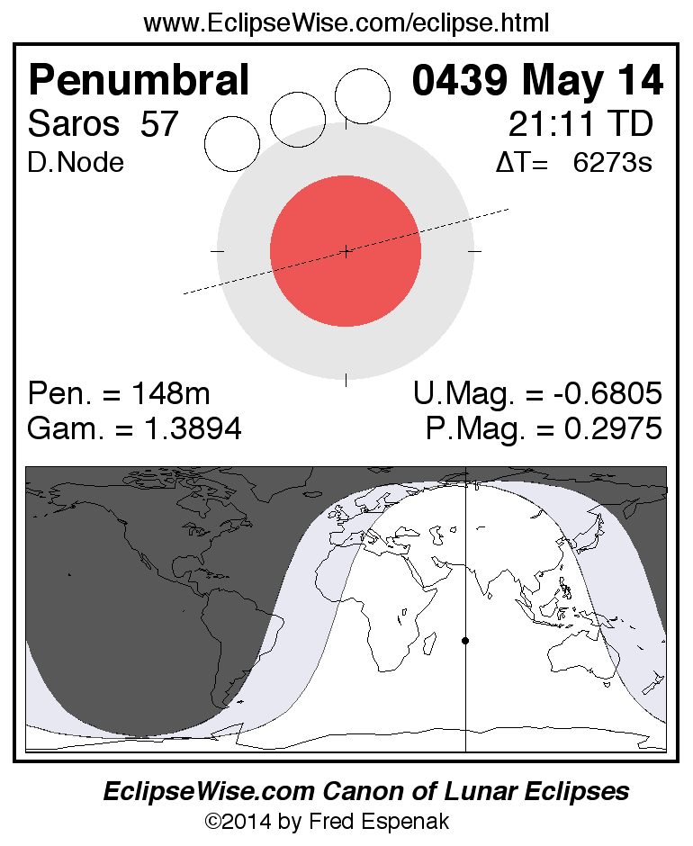 Another lunar eclipse occurs one synodic month after the 0439 May 14 eclipse. It is the penumbral lunar eclipse of 0439 Jun 13.
