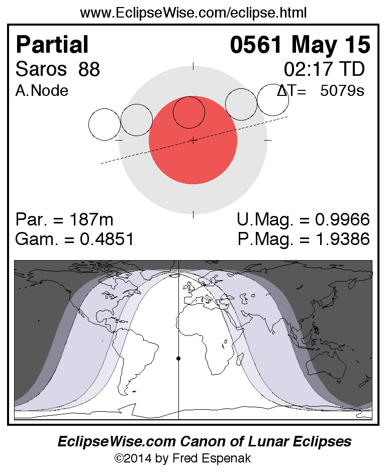 The instant of greatest eclipse takes place on 0561 May 15 at 02:16:57 TD (00:52:18 UT1).