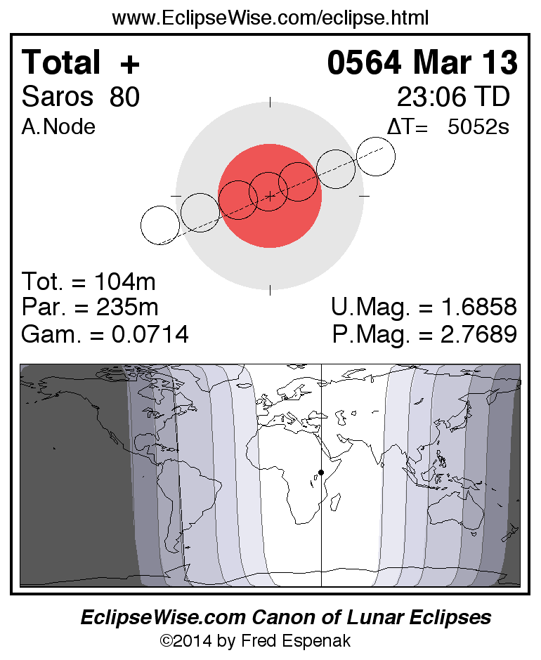 The instant of greatest eclipse takes place on 0564 Mar 13 at 23:06:09 TD (21:41:57 UT1).