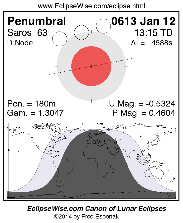 Another lunar eclipse occurs one synodic month after the 0613 Jan 12 eclipse. It is the penumbral lunar eclipse of 0613 Feb 10.