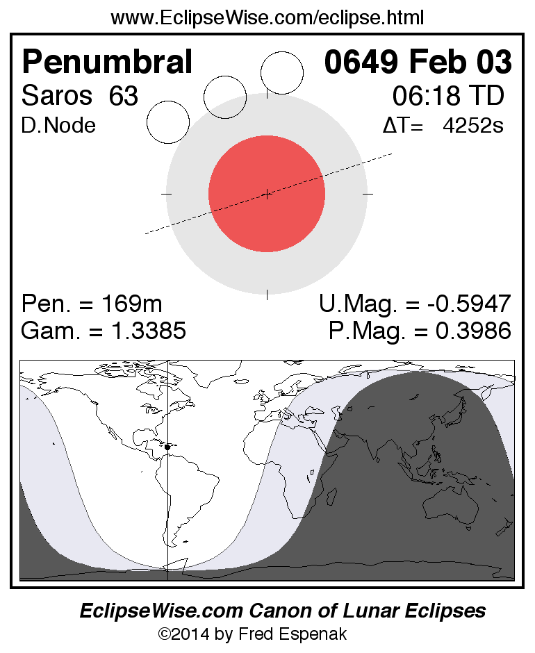 The penumbral lunar eclipse of 0649 Feb 03 is followed two weeks later by a annular solar eclipse on 0649 Feb 17.