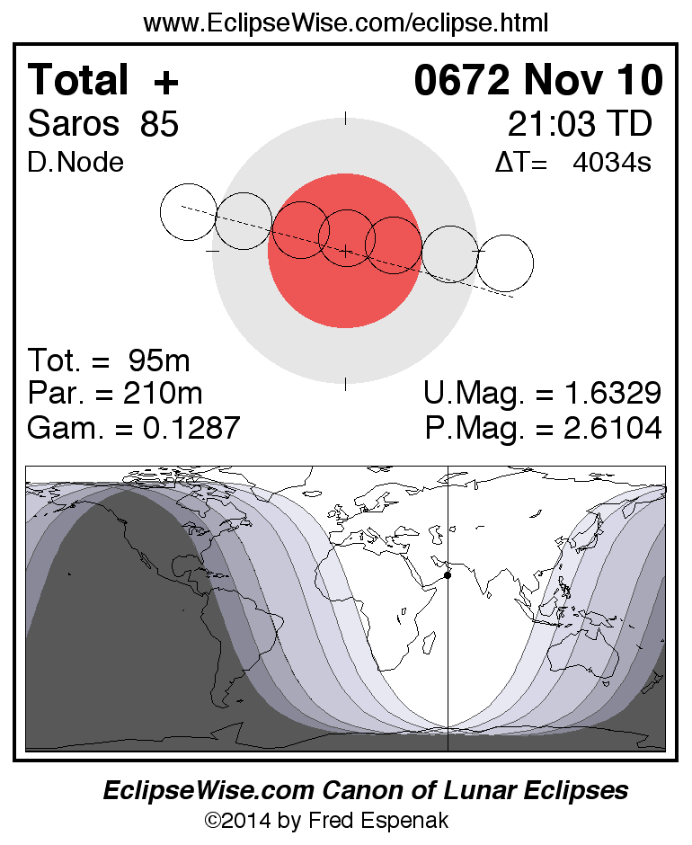 The total lunar eclipse of 0672 Nov 10 is followed two weeks later by a partial solar eclipse on 0672 Nov 25.