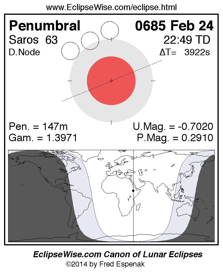 Another lunar eclipse occurs one synodic month after the 0685 Feb 24 eclipse. It is the penumbral lunar eclipse of 0685 Mar 26.