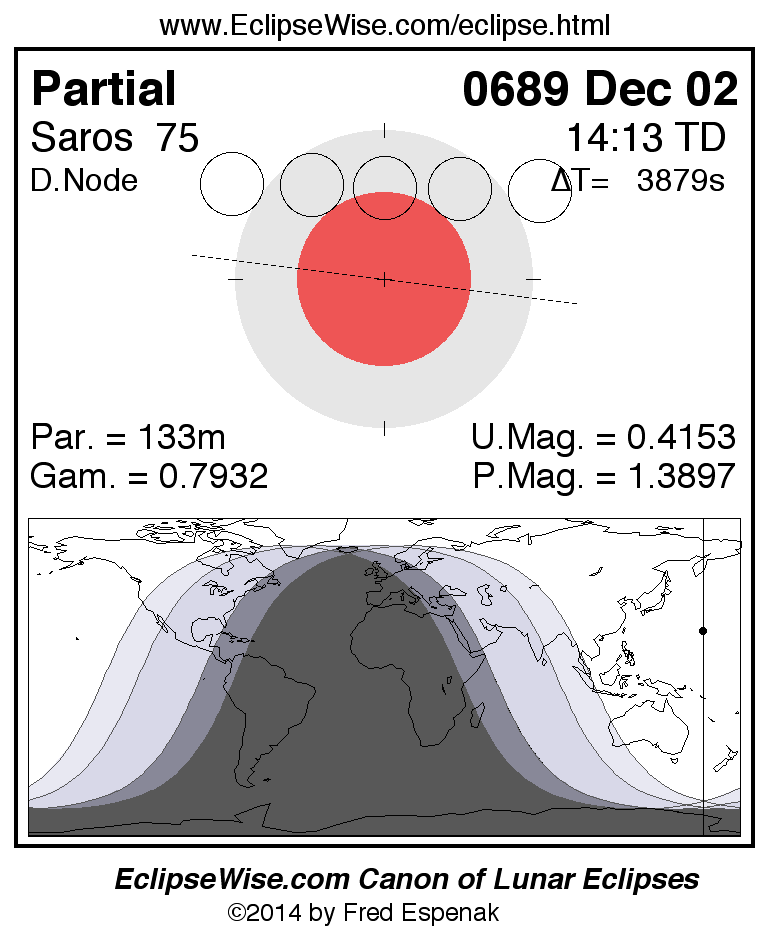 The instant of greatest eclipse takes place on 0689 Dec 02 at 14:12:49 TD (13:08:11 UT1).