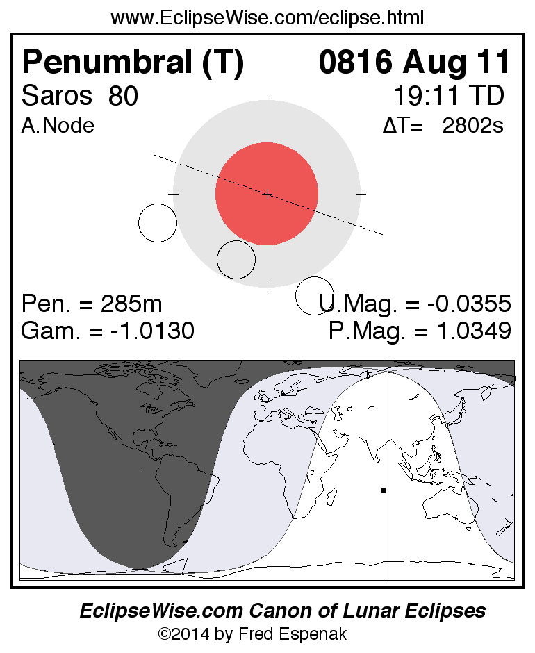 The penumbral lunar eclipse of 0816 Aug 11 is followed two weeks later by a total solar eclipse on 0816 Aug 26.