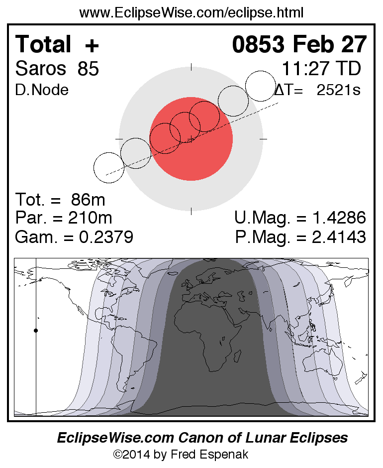 The total lunar eclipse of 0853 Feb 27 is followed two weeks later by a partial solar eclipse on 0853 Mar 13.