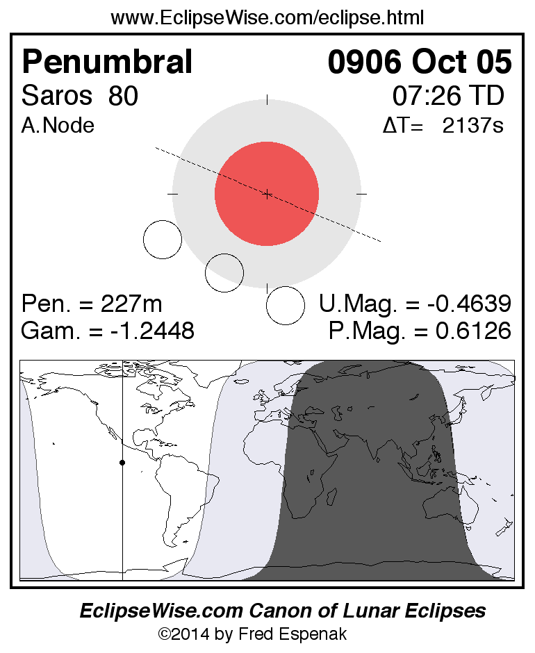 The penumbral lunar eclipse of 0906 Oct 05 is followed two weeks later by a total solar eclipse on 0906 Oct 20.