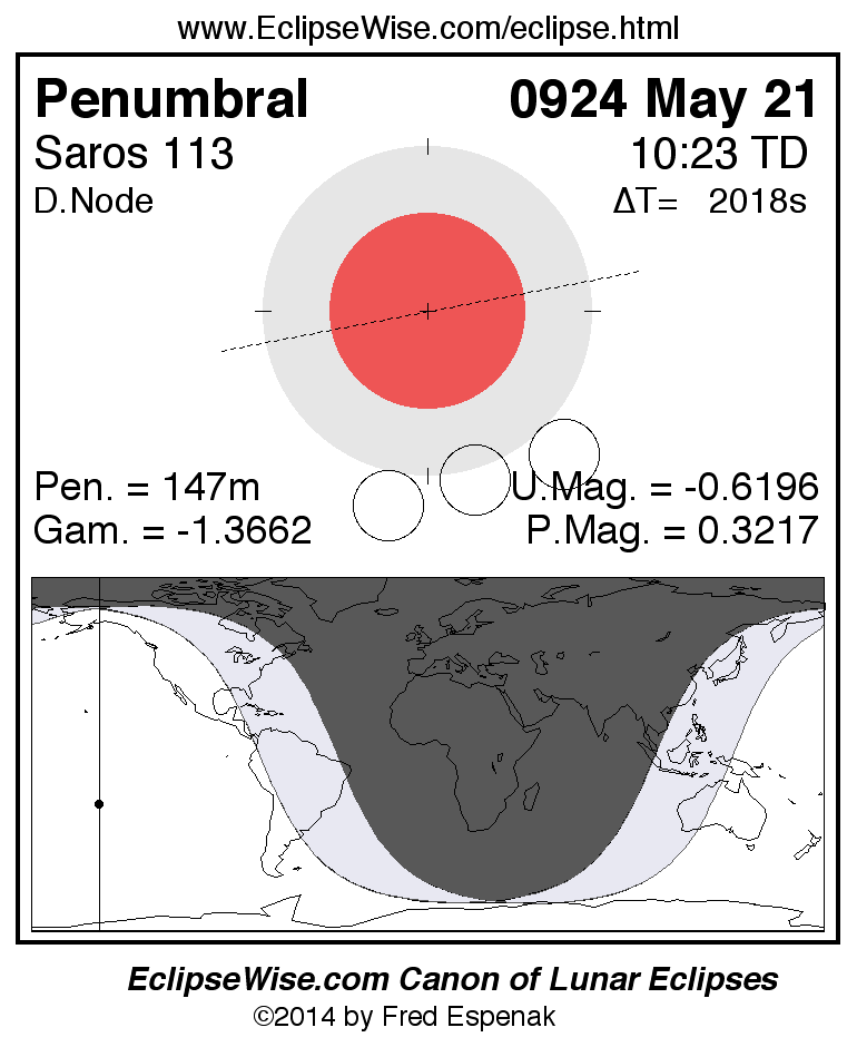 Another lunar eclipse occurs one synodic month before the 0924 May 21 eclipse. It is the penumbral lunar eclipse of 0924 Apr 22.