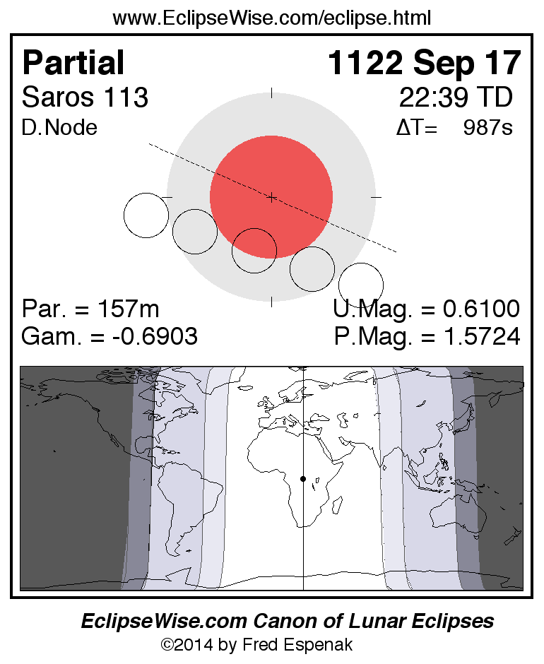 The instant of greatest eclipse takes place on 1122 Sep 17 at 22:39:14 TD (22:22:47 UT1).