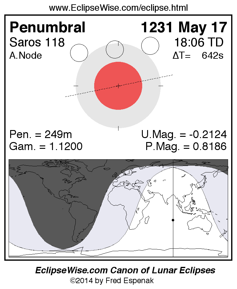 The penumbral lunar eclipse of 1231 May 17 is preceded two weeks earlier by a total solar eclipse on 1231 May 03.