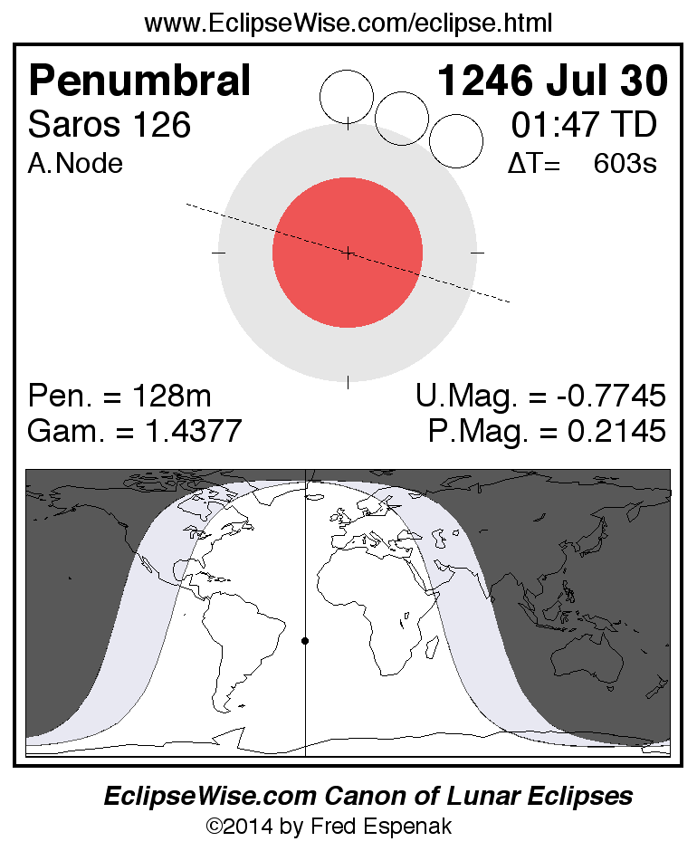 Another lunar eclipse occurs one synodic month before the 1246 Jul 30 eclipse. It is the penumbral lunar eclipse of 1246 Jun 30.