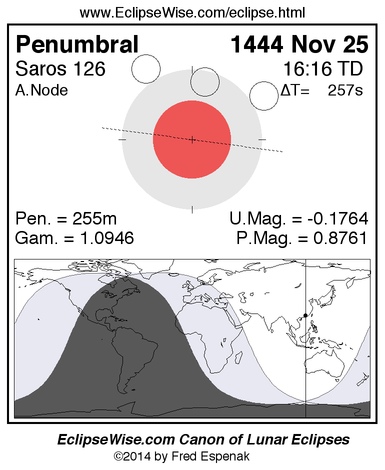 The penumbral lunar eclipse of 1444 Nov 25 is preceded two weeks earlier by a hybrid solar eclipse on 1444 Nov 10.
