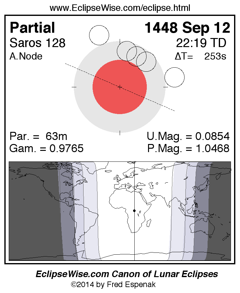 The instant of greatest eclipse takes place on 1448 Sep 12 at 22:19:29 TD (22:15:16 UT1).