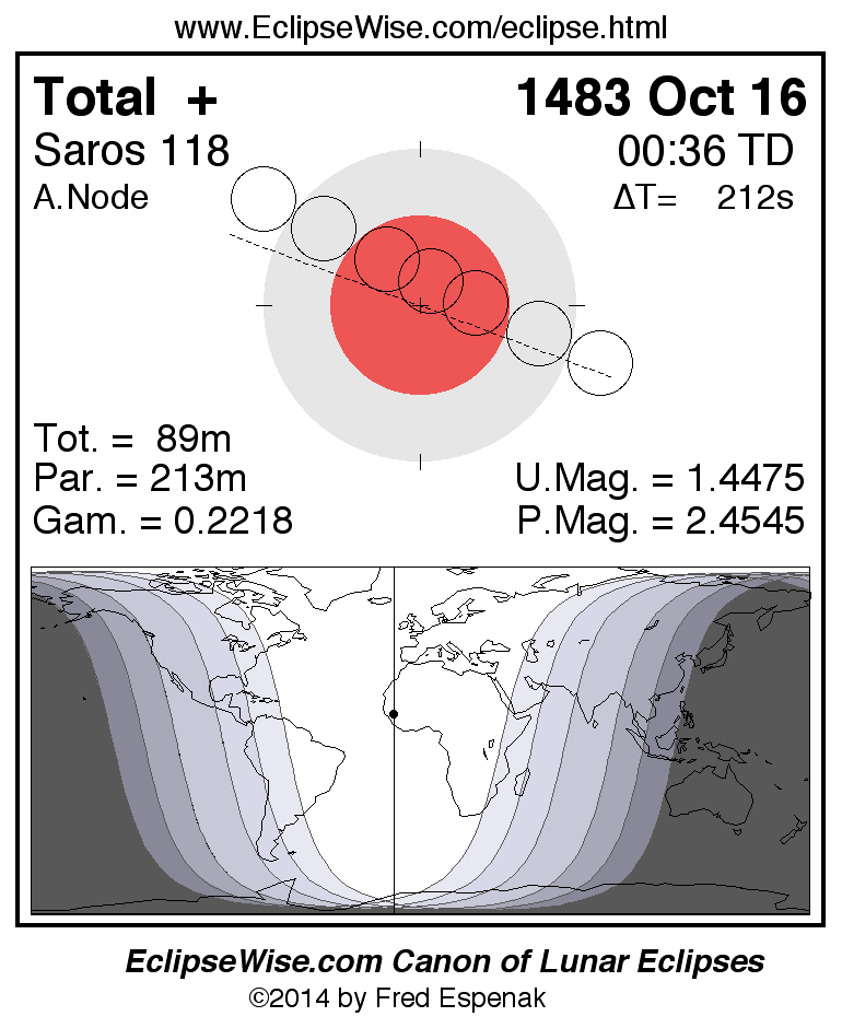 The instant of greatest eclipse takes place on 1483 Oct 16 at 00:35:58 TD (00:32:26 UT1).