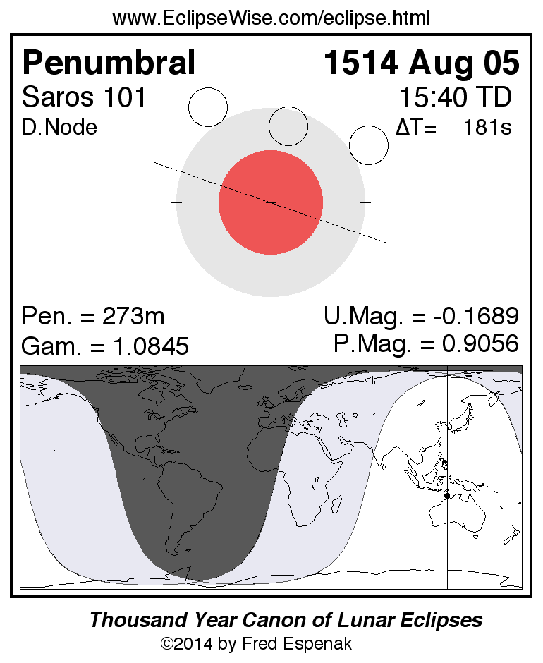 The penumbral lunar eclipse of 1514 Aug 05 is followed two weeks later by a total solar eclipse on 1514 Aug 20.