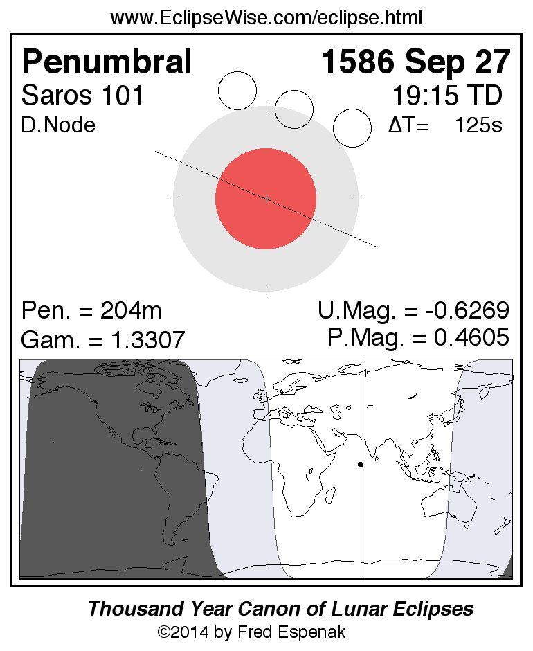 The penumbral lunar eclipse of 1586 Sep 27 is followed two weeks later by a total solar eclipse on 1586 Oct 12.