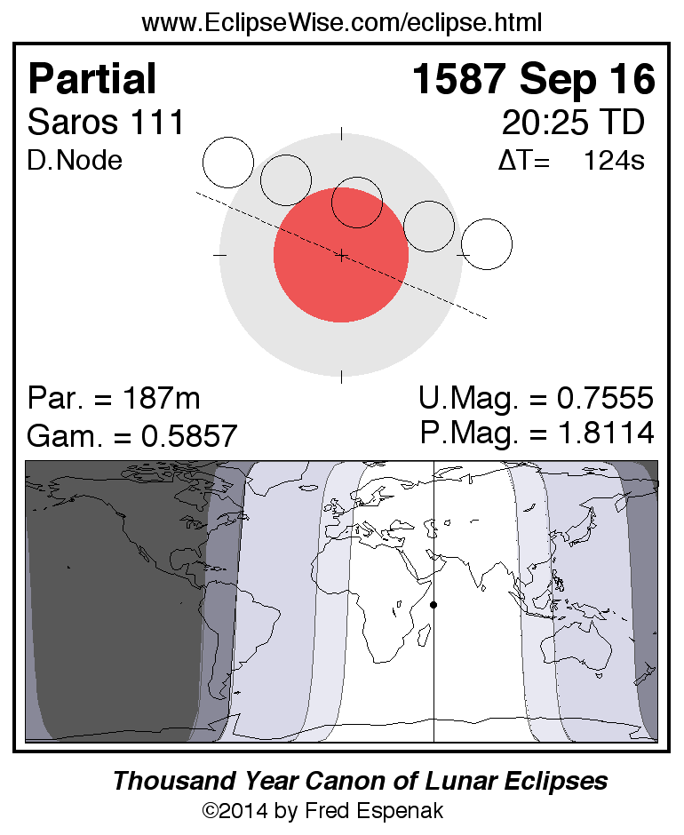 The instant of greatest eclipse takes place on 1587 Sep 16 at 20:25:04 TD (20:22:60 UT1).