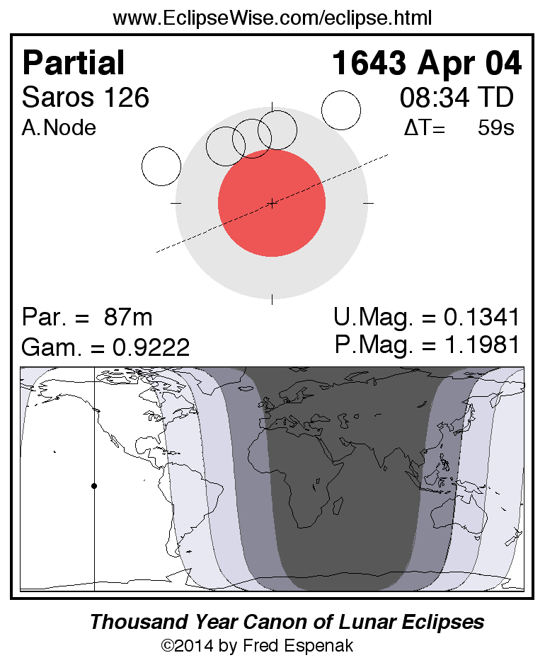 The partial lunar eclipse of 1643 Apr 04 is preceded two weeks earlier by a total solar eclipse on 1643 Mar 20.