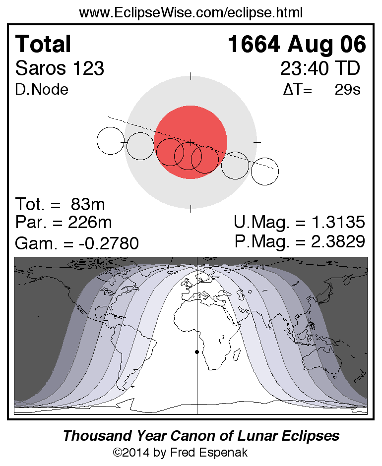 The instant of greatest eclipse takes place on 1664 Aug 06 at 23:40:03 TD (23:39:34 UT1).