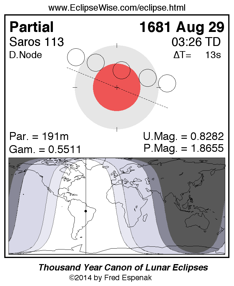 The instant of greatest eclipse takes place on 1681 Aug 29 at 03:25:57 TD (03:25:44 UT1).