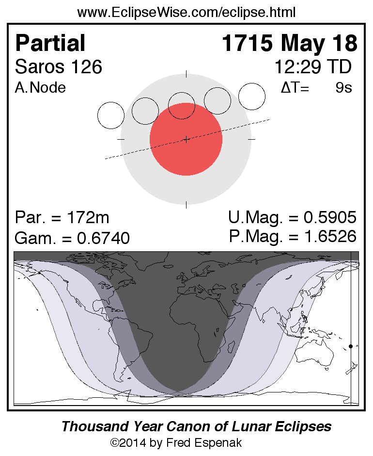 The partial lunar eclipse of 1715 May 18 is preceded two weeks earlier by a total solar eclipse on 1715 May 03.