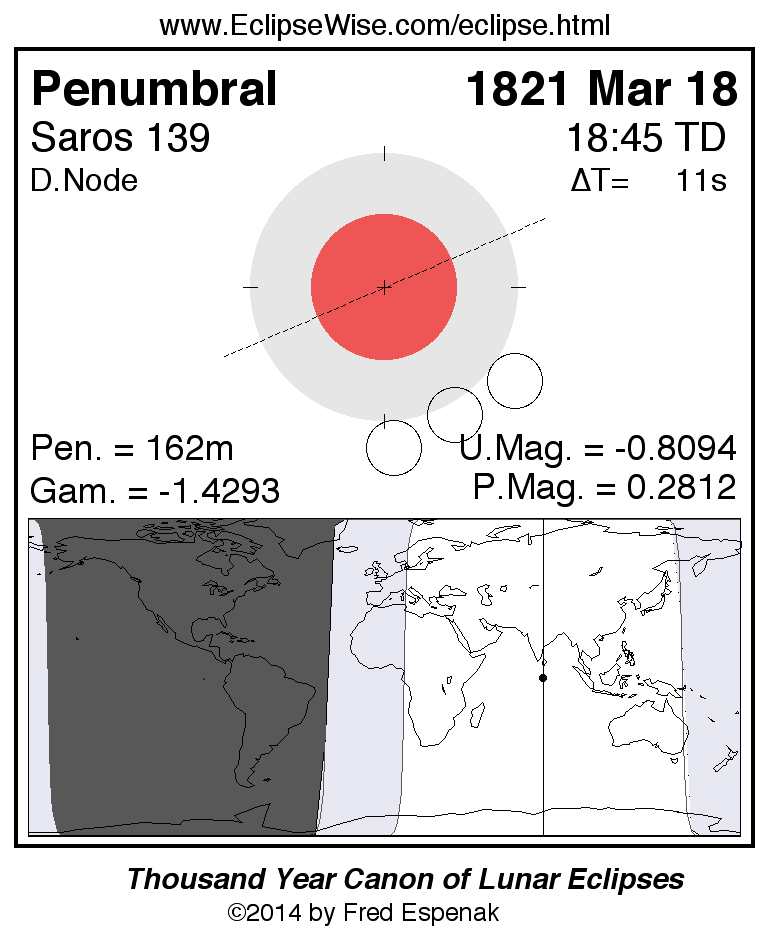 The penumbral lunar eclipse of 1821 Mar 18 is preceded two weeks earlier by a total solar eclipse on 1821 Mar 04.